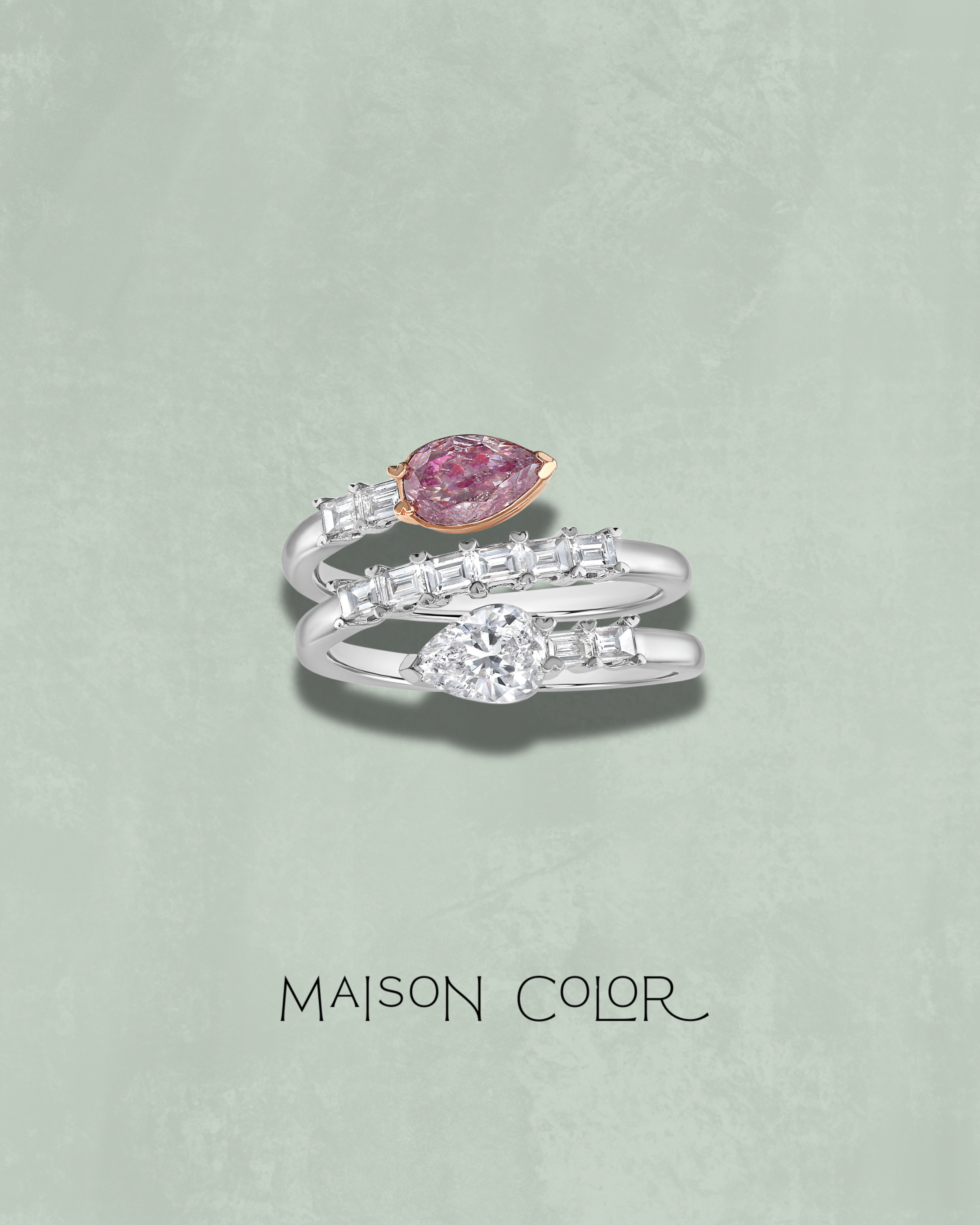 A captivating play of movement and contrast, this spiral ring winds elegantly around the finger, featuring a harmonious pairing of a natural pink pear-shaped diamond and a white pear-shaped diamond at each end. The graceful curve of the spiral is accented with a trail of sleek white diamond baguettes, adding a rhythmic sparkle that draws the eye upward. Sculpted in platinum, this design blends fluidity with structure—an artistic statement of modern femininity and rare, natural beauty.