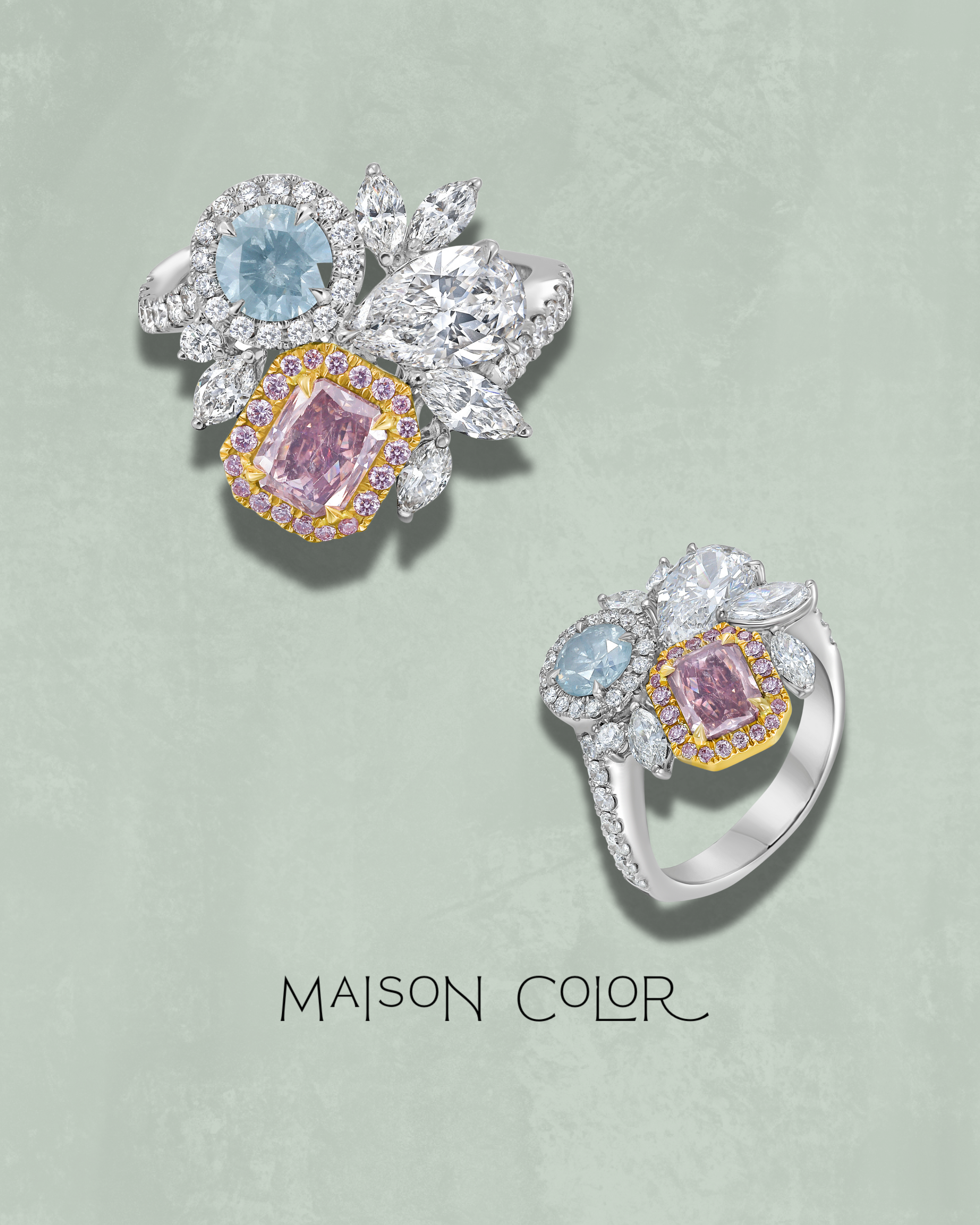 A poetic meeting of color and light, this ring unites three rare natural diamonds in perfect harmony — a Fancy Brown Pink, a Fancy Light Greenish Blue, and a pure E-color VVS2 white diamond. Each stone is meticulously chosen for its character and brilliance, creating a balance that feels both effortless and extraordinary. Handcrafted in 18k gold, this trio celebrates the beauty of contrast — soft hues that speak to nature’s artistry, brought together in timeless form.