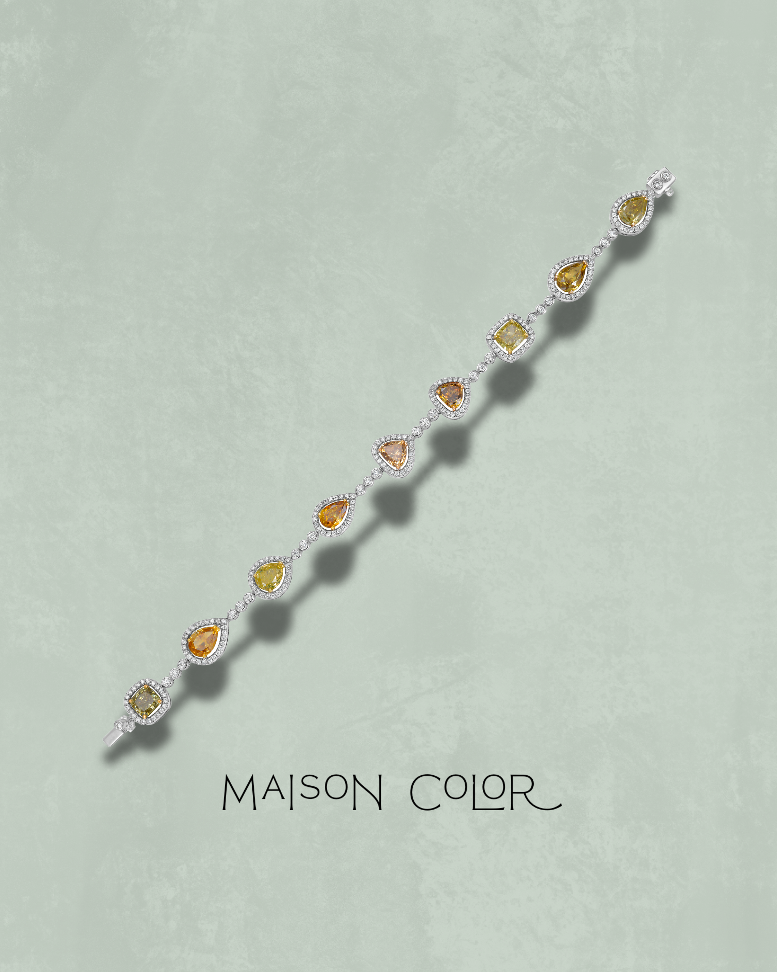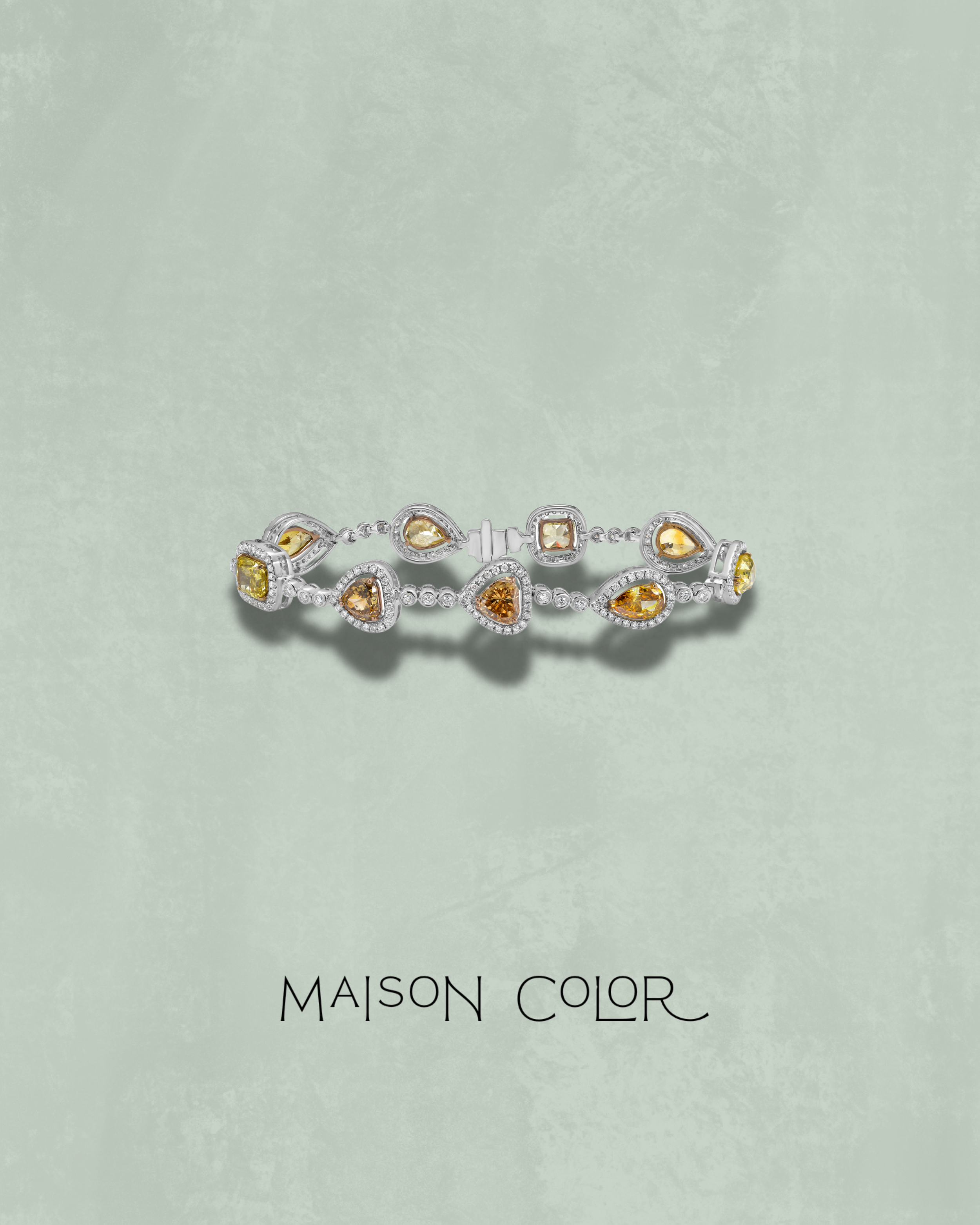 This bracelet features an artful mix of yellow, brown, and greenish-hued diamonds in a variety of elegant shapes. Each stone is surrounded in a white diamond halo to highlight its unique brilliance and character, creating a flowing rhythm along the wrist. Crafted in 18k white gold, it is a statement of refined elegance and enduring style.