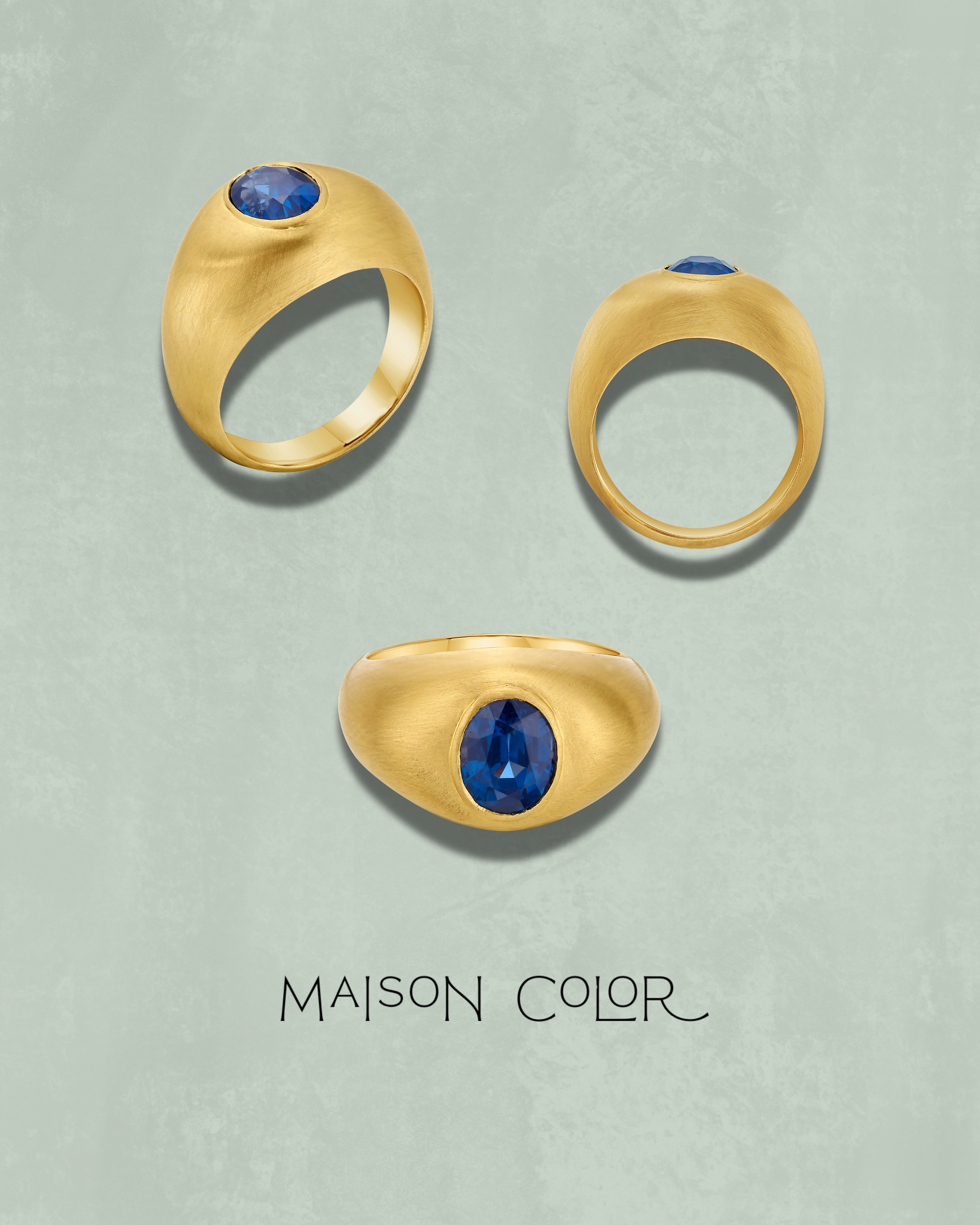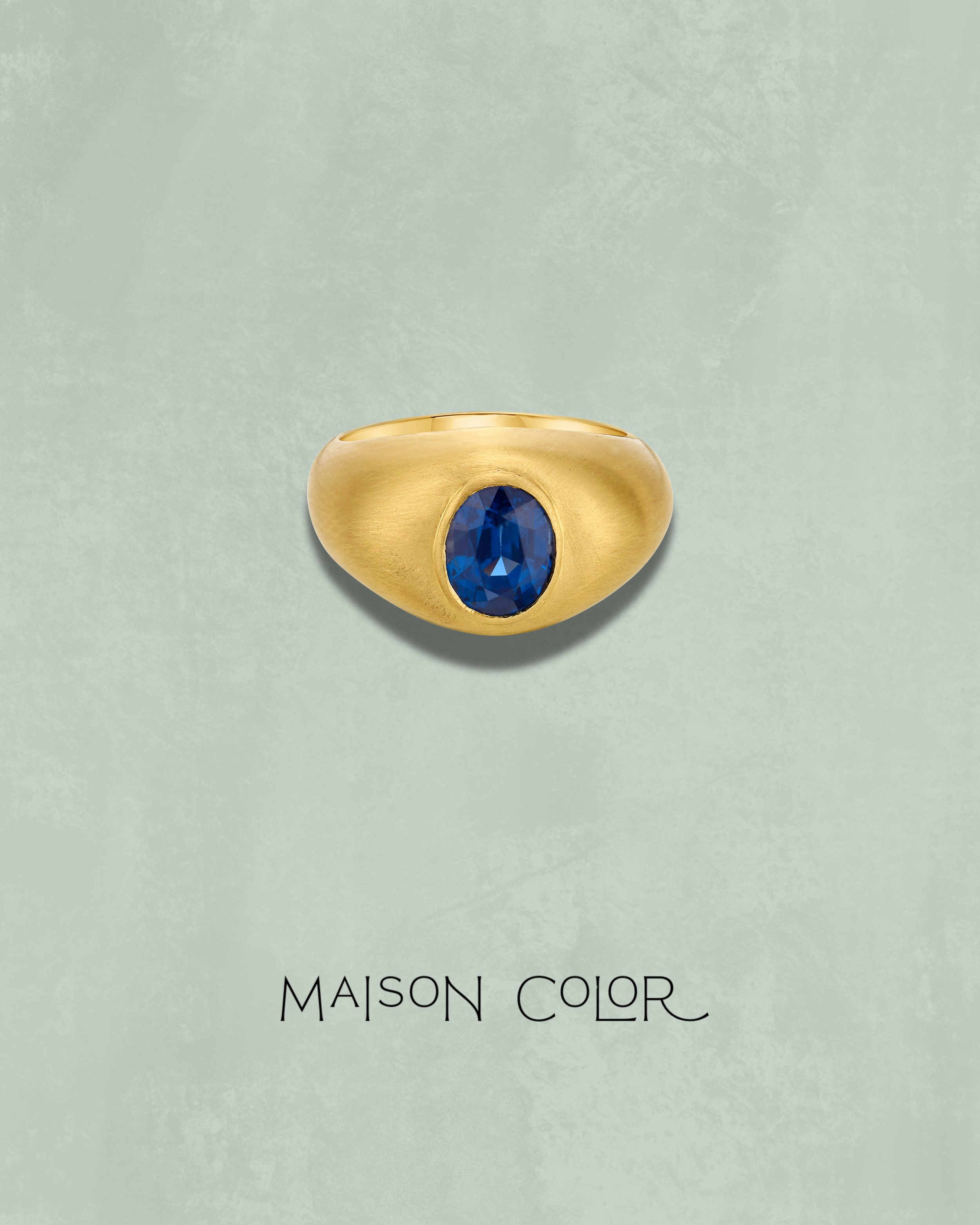Sculptural and elemental, this bold dome ring is anchored by a rare cobalt blue spinel—an unheated gem prized for its piercing clarity and deep, electric hue. The vivid center stone is bezel-set into a domed band of brushed 18k gold, its matte texture offering a striking contrast to the spinel’s crystalline brilliance.