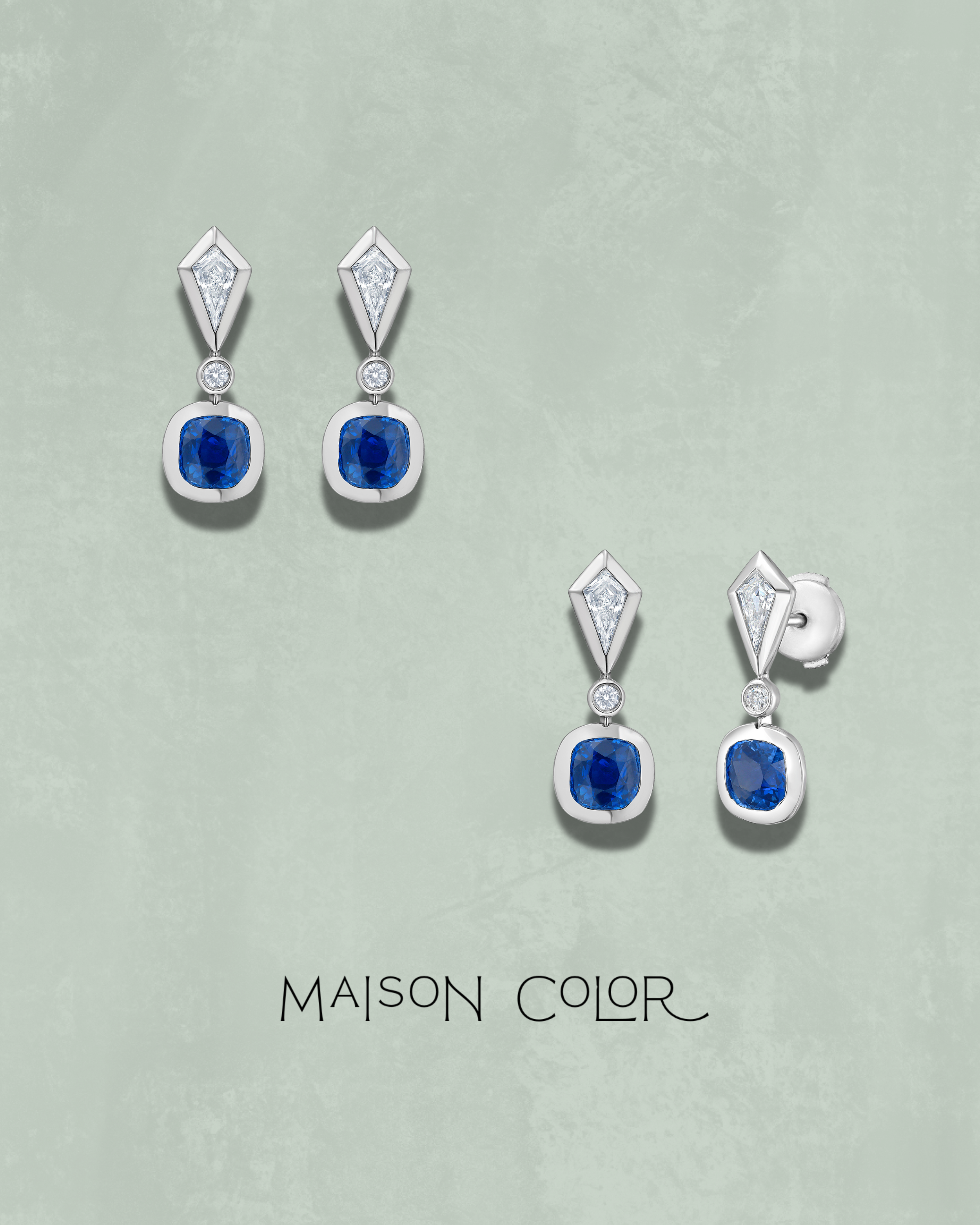 A striking interplay of form and color, these drop earrings feature richly hued blue sapphires paired with sculptural white diamond kite shapes, all set in luminous platinum. The deep, velvety tone of the sapphires is offset by the crisp brilliance of the diamonds, creating a refined contrast that feels both modern and timeless. Suspended with graceful movement, this design evokes a quiet opulence—elegant enough for evening, yet restrained enough for day.