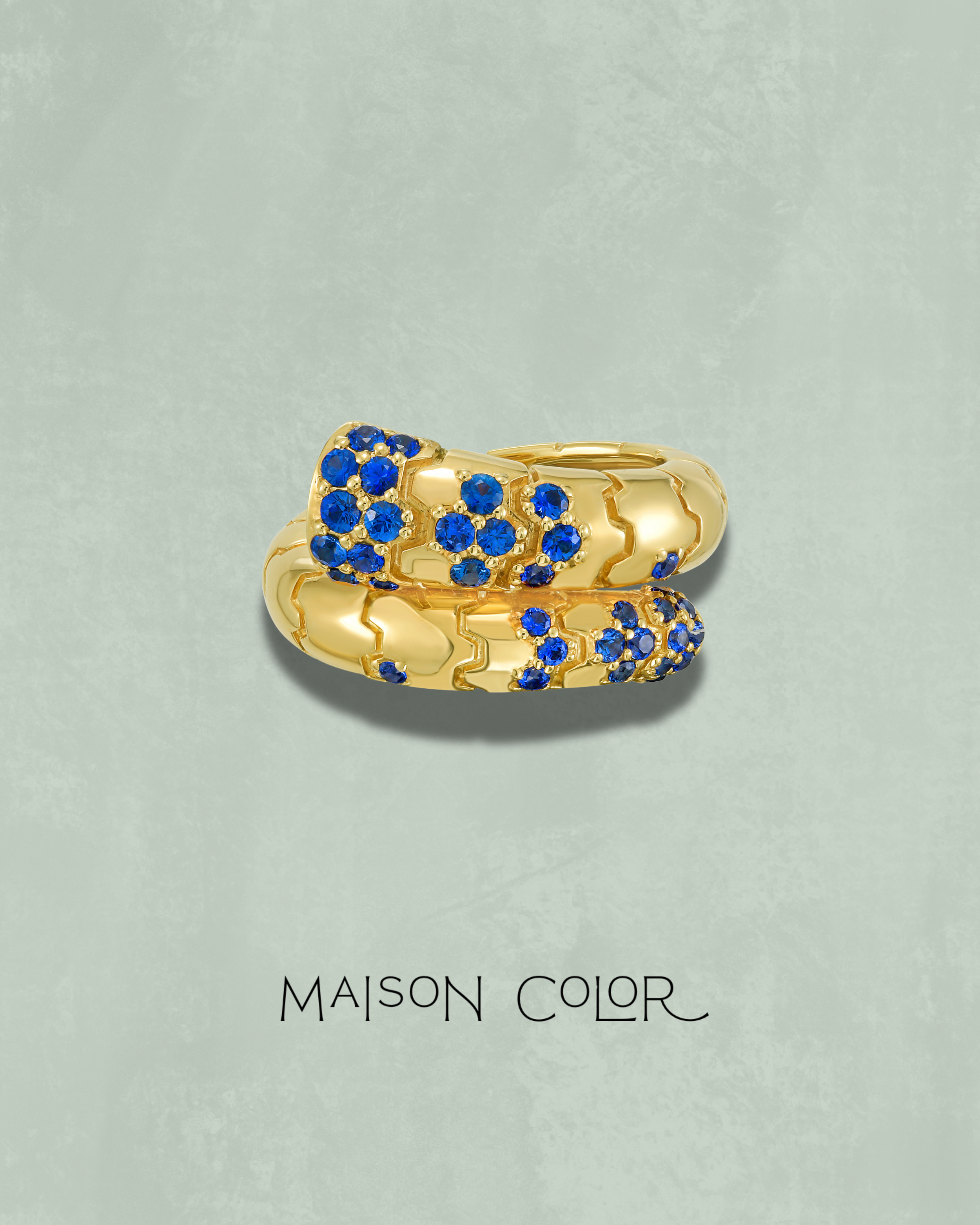 Inspired by the Greek word for serpent, the Ophis (OH-fis) ring coils gracefully in 18k yellow gold, set with deep blue sapphires that shimmer with every movement. Its sinuous form captures both strength and elegance, making it a striking symbol of transformation and timeless beauty.