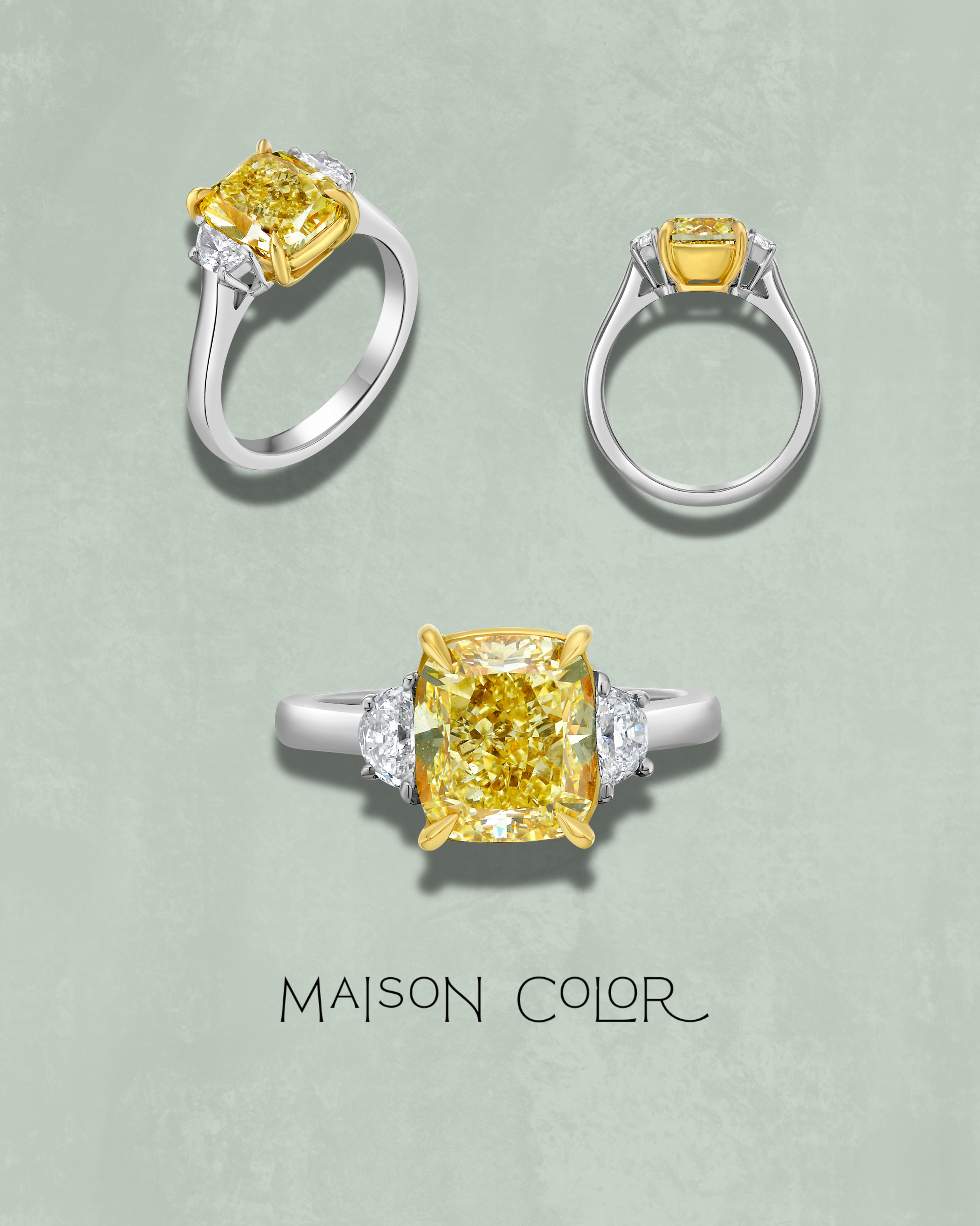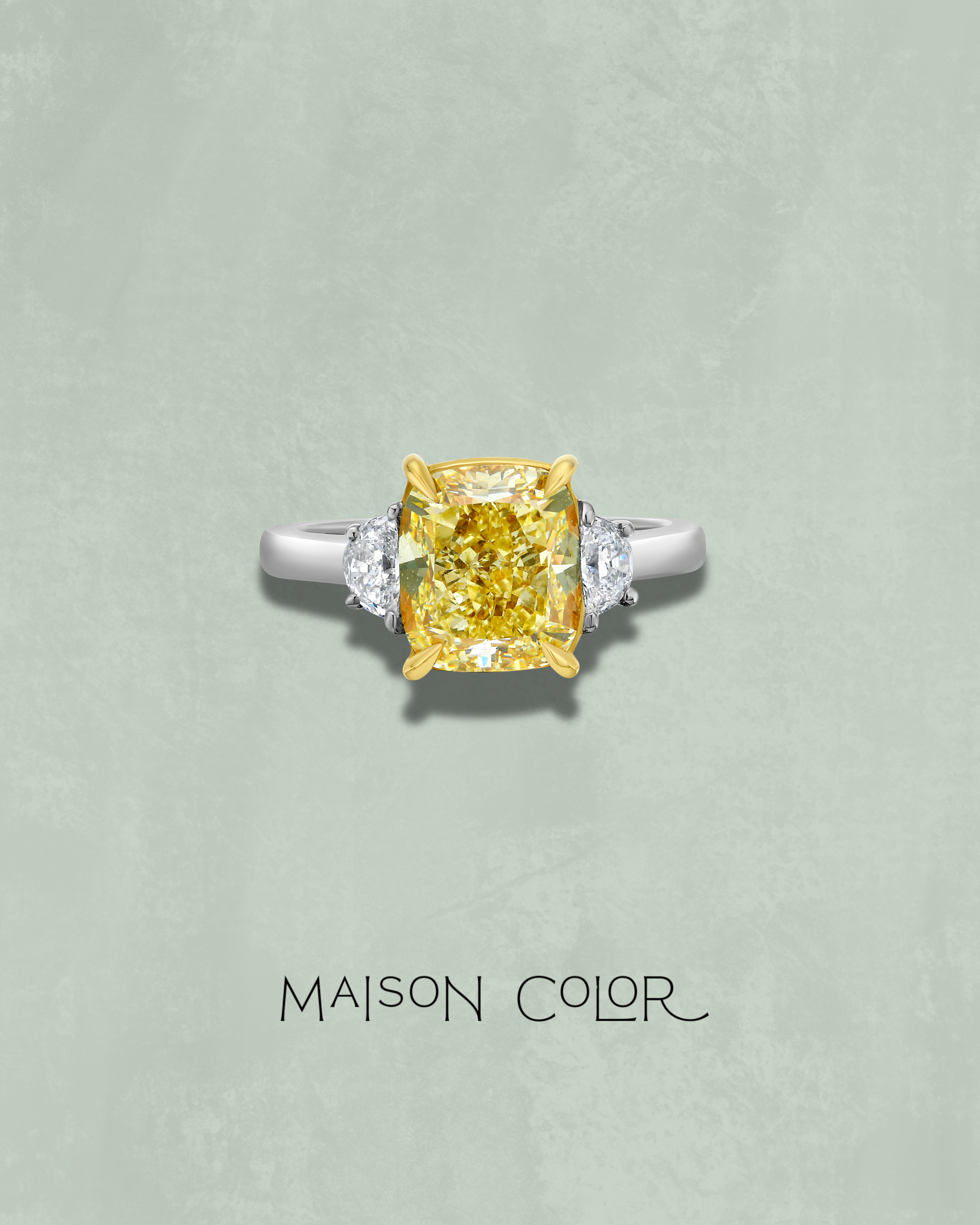A study in subtle contrast and tailored design, this three-stone ring centers a 3.08-carat cushion-cut natural fancy light yellow diamond, graded VS1 for its high clarity. Framed by half moon white diamond side stones, the composition emphasizes clean geometry and balance. The center stone is set with 18k yellow gold prongs to draw out its delicate hue, while the platinum band offers a sleek, architectural foundation. Understated, sculptural, and luminous - a modern classic.