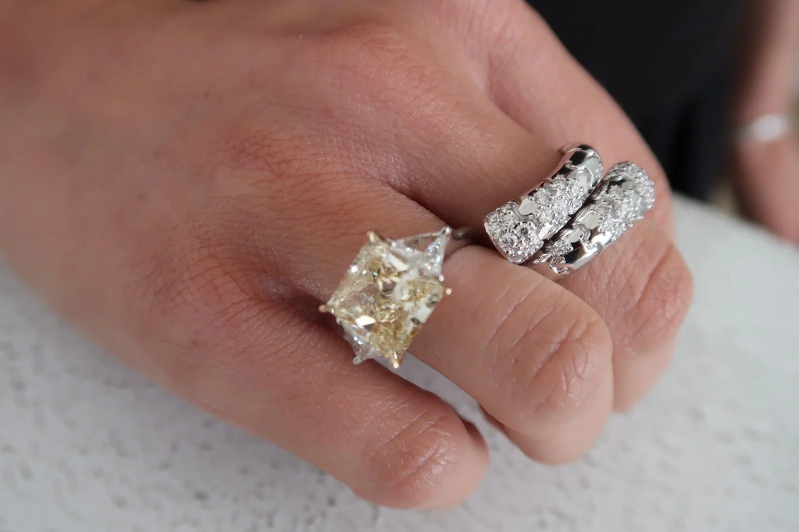 The clean, architectural lines of the princess cut lend a modern clarity to the composition, while the rich golden hue of the center stone brings warmth and radiance.