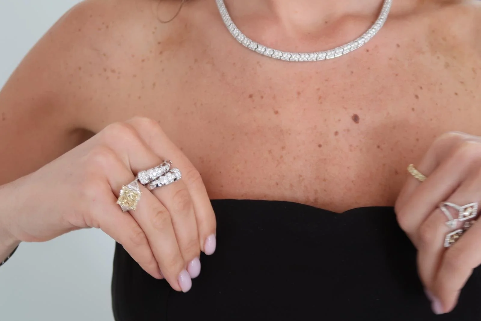 An exquisite interpretation of a classic silhouette, this three-stone ring features a princess-cut Fancy Yellow VS2 natural diamond at its center, flanked by two perfectly matched white diamonds.